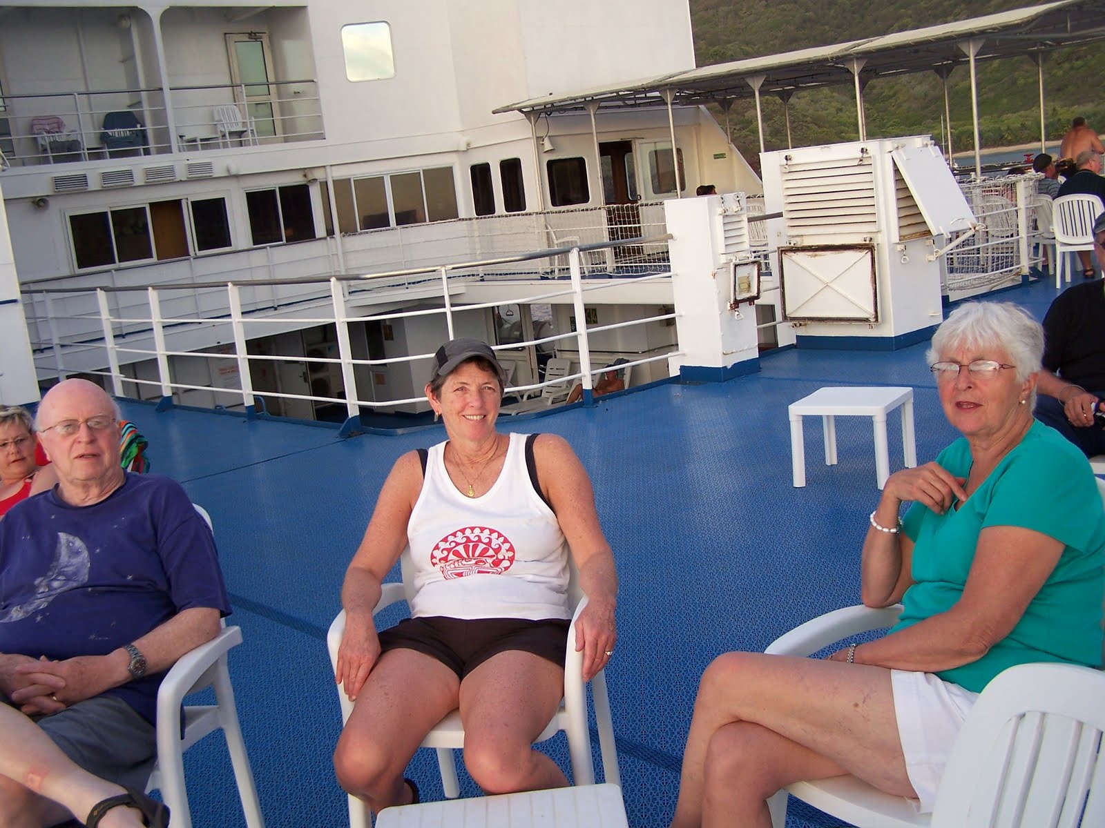 In general the sunsets have been magnificent and the bays where we pull into incrediably beautiful. The only other tourist we have seen are three couples who have been sailing around the world on personal sailboats that would be anchored at a bay where we would be visiting and we would see them walking in the village. Now a little about life on board the container ship. It is fasinating to watch them load and unload supplies. They do not have a lot of containers on board but usually anything from crates to cars to cattle that they are bring to the islands. They unload onto platform boats that we have onboard and then take them into shore. Many times we are way too big to dock and all operations are done on a variety of boats that we carry with us. We have a deep sea fishing boat, two whaleboats that seat about 60 passengers that they ferry us to shore in, a number of smaller whaleboats that they take us sometimes but usually cargo and about 3 huge flatbed boats that they use to ferry cargo, just to name a few. Our routine is to spend the day ashorer doing all the activities they have designed for us and then return to the ship in late afternoon. Paul usually does the daily uphill hikes that range from 10 miles to 3 kilometers. I went once on a 6 kilometer one that was not the hardest but it was really steep for me. I settle for swimming everyday with Nancy in the pool onboard and sometimes in the ocean. After dinner we usually play cards all evening but lqst night was special as it was Polynesan night. They had dinner out by the pool that they had decorated and then they had a kind of talent night for passengers and the crew with lots of Polynesan dancing. They have their own small band made up of crew members that played until 1 am. It was a very entertaining night and it was no surprise that the crew was WAYYYY more talented than the passengers. Well sorry to have rambled on with different topics but we can not write often and I did want to share some of the sights and activites we have done. More when we get stateside and we can show you some of our pictures. We are great and really enjoying the Barretts. Happy Birthday Stephan on Thursday if we can not communicate with you on Thursday!!!!!